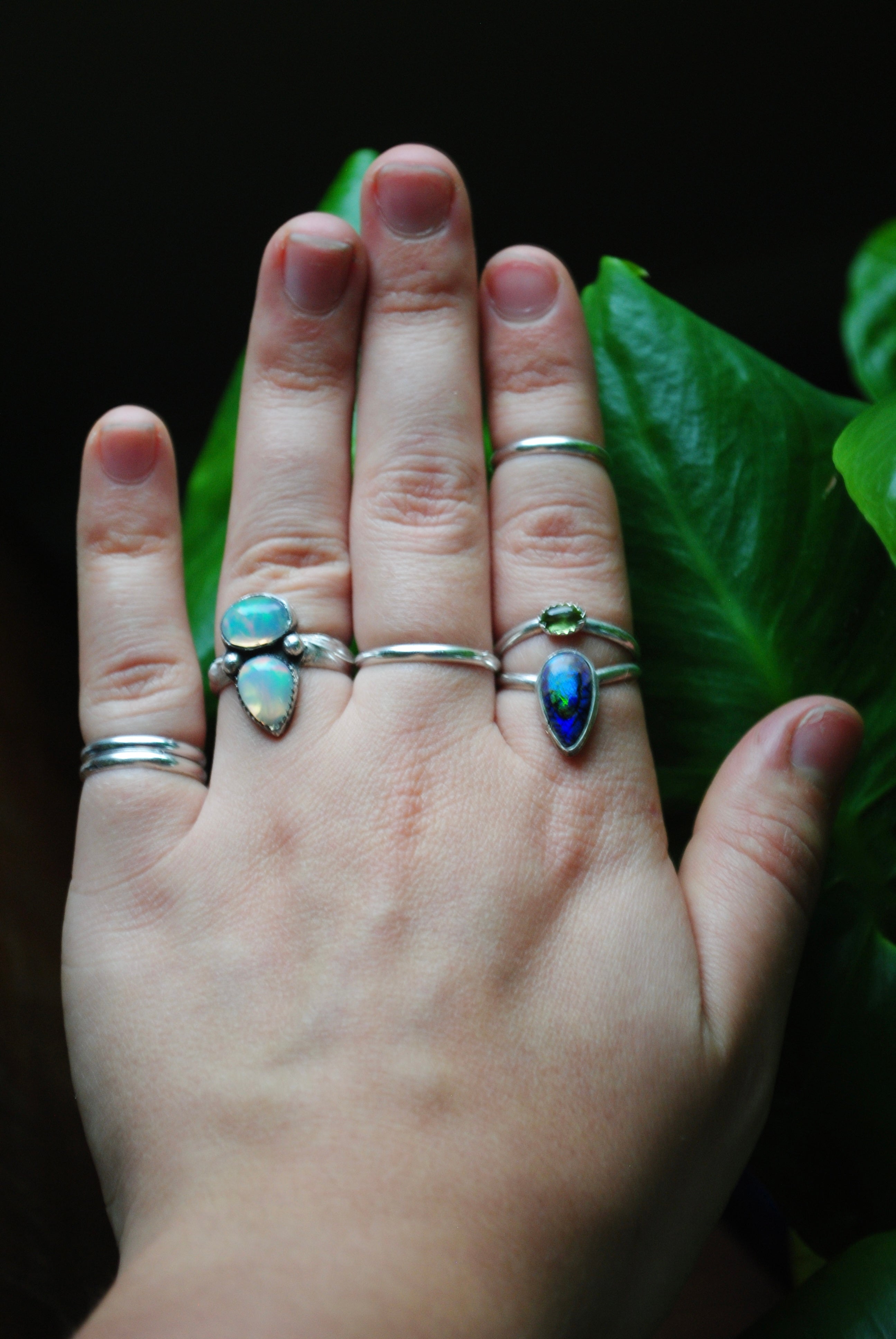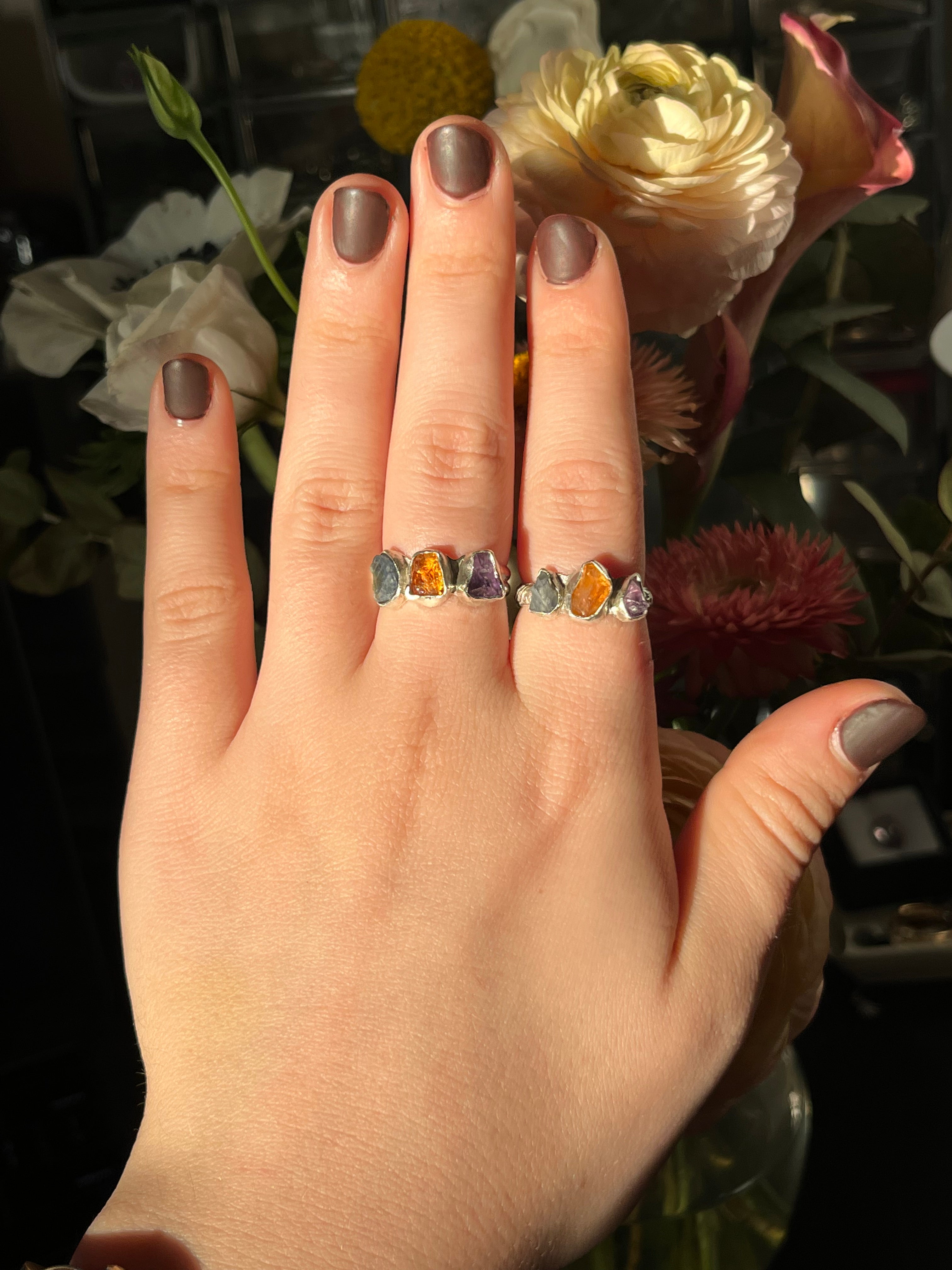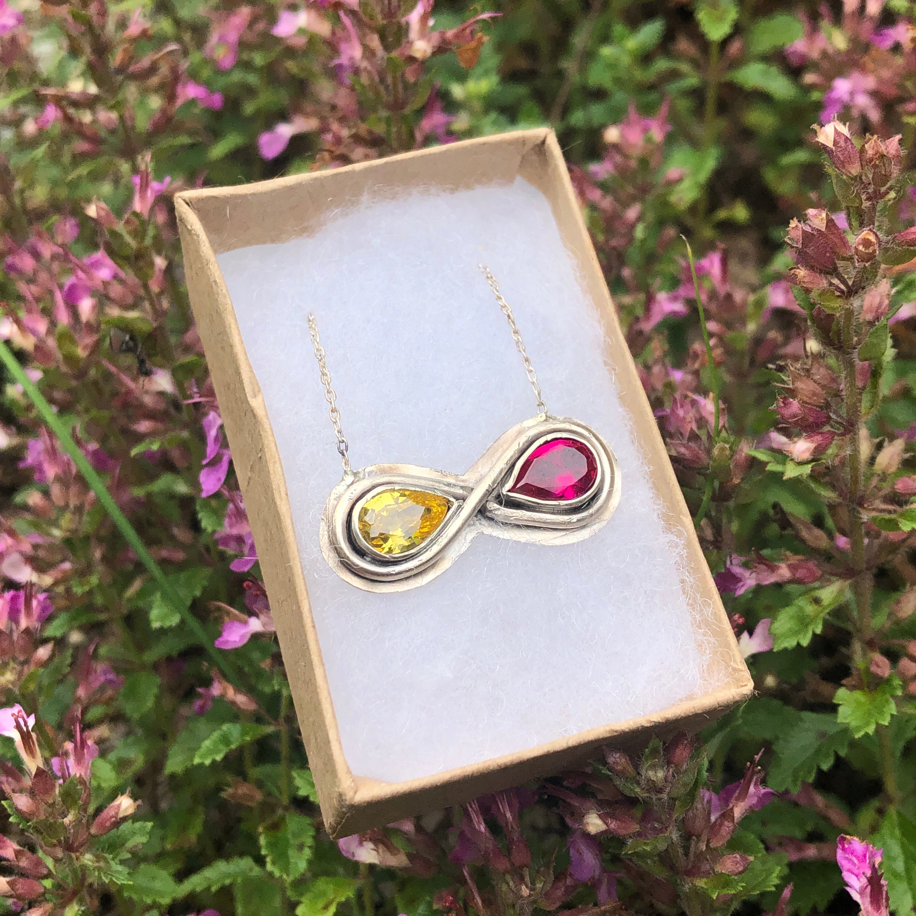 Sterling silver, 10k gold, tourmaline, and sapphire