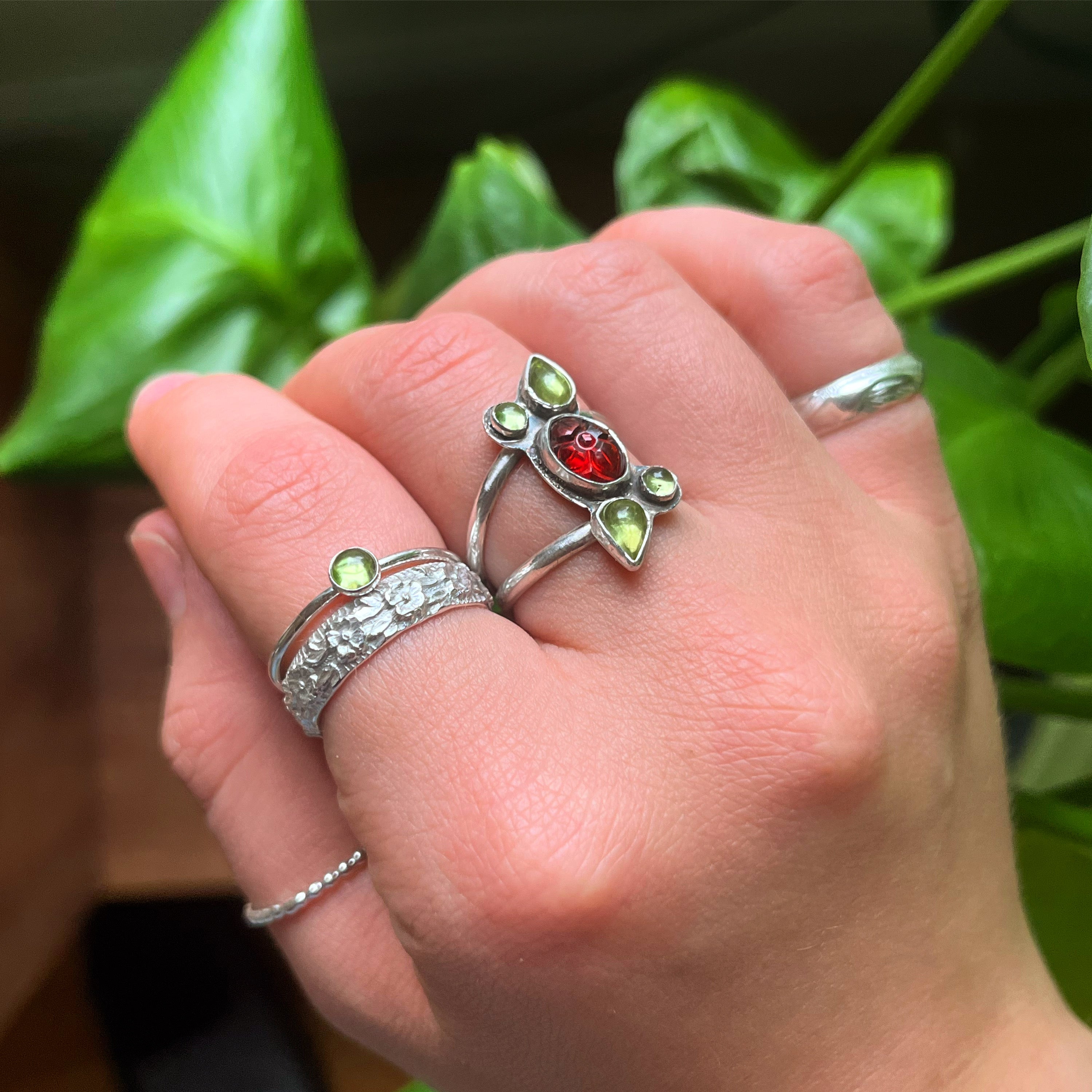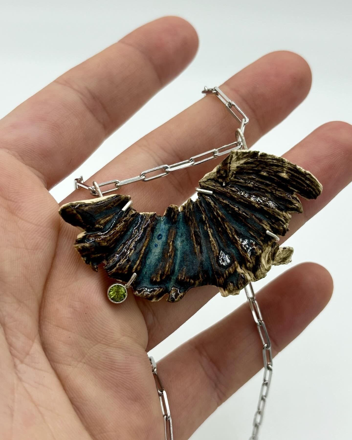 This necklace is made with a discarded and glazed ceramic trimming, which reminds me of turkeytails or mushroom gills. A small peridot is nestled underneath