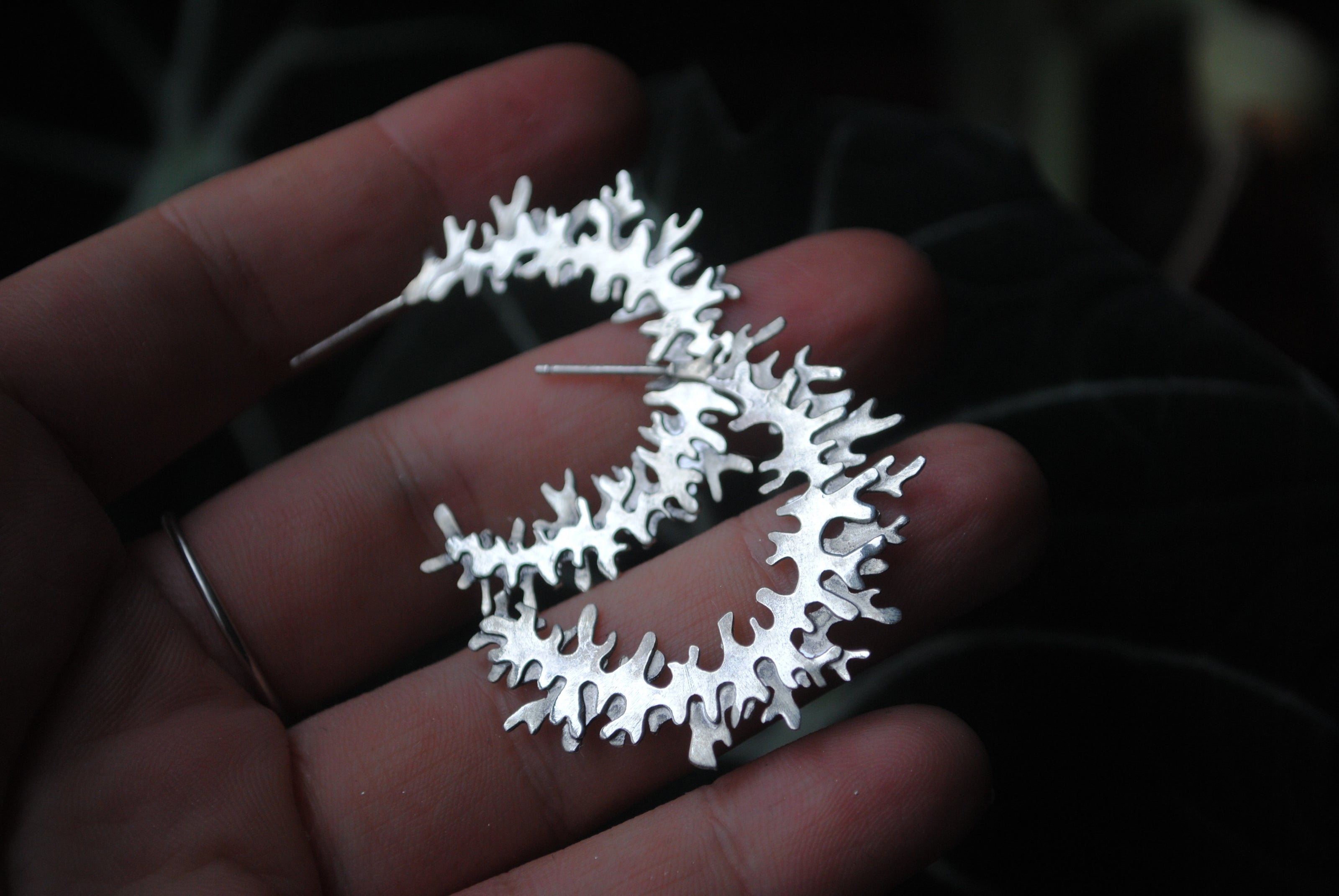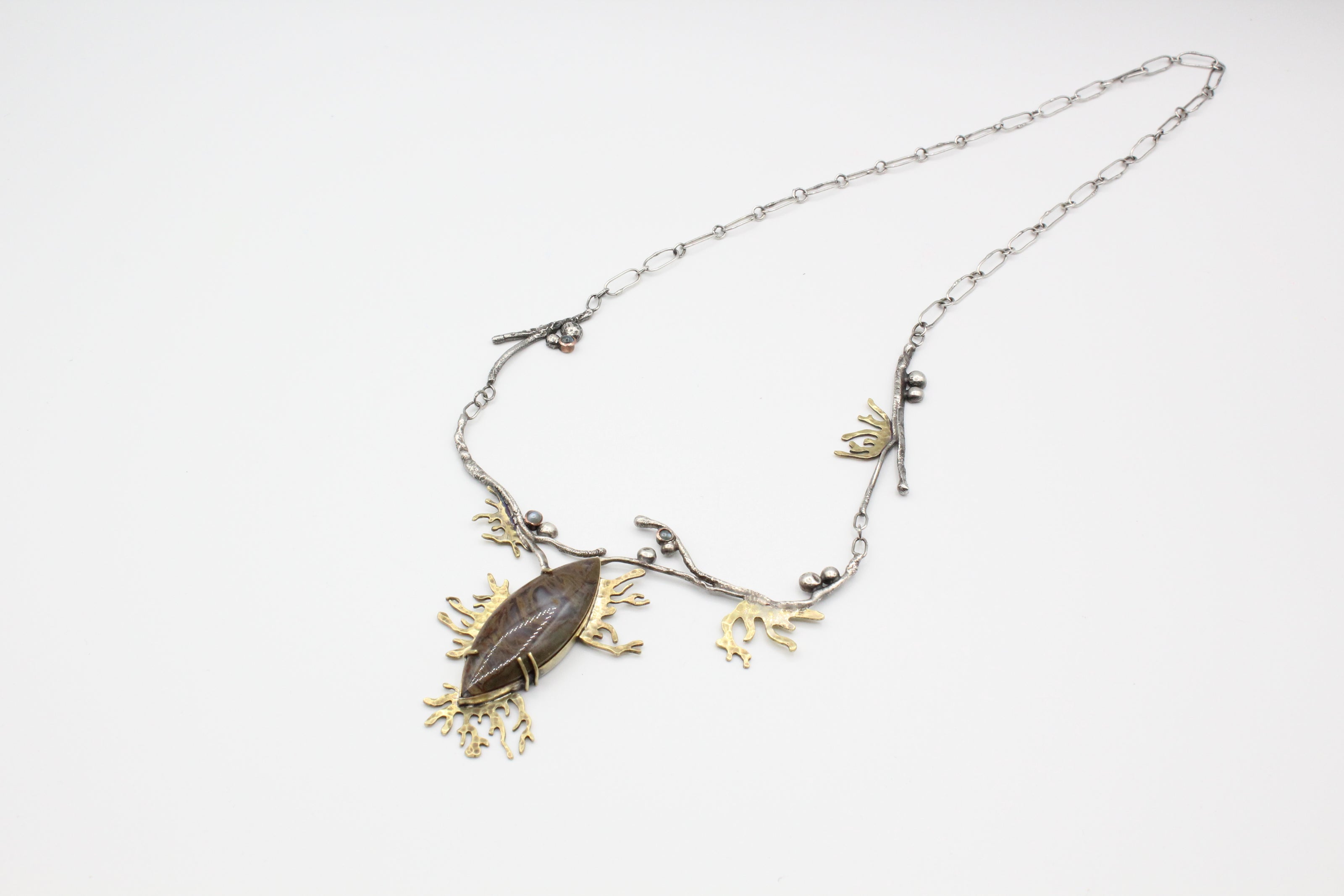 Inspired by the complexity of wood decomposition. Fused silver, brass, agate, and blue tiger's eye.