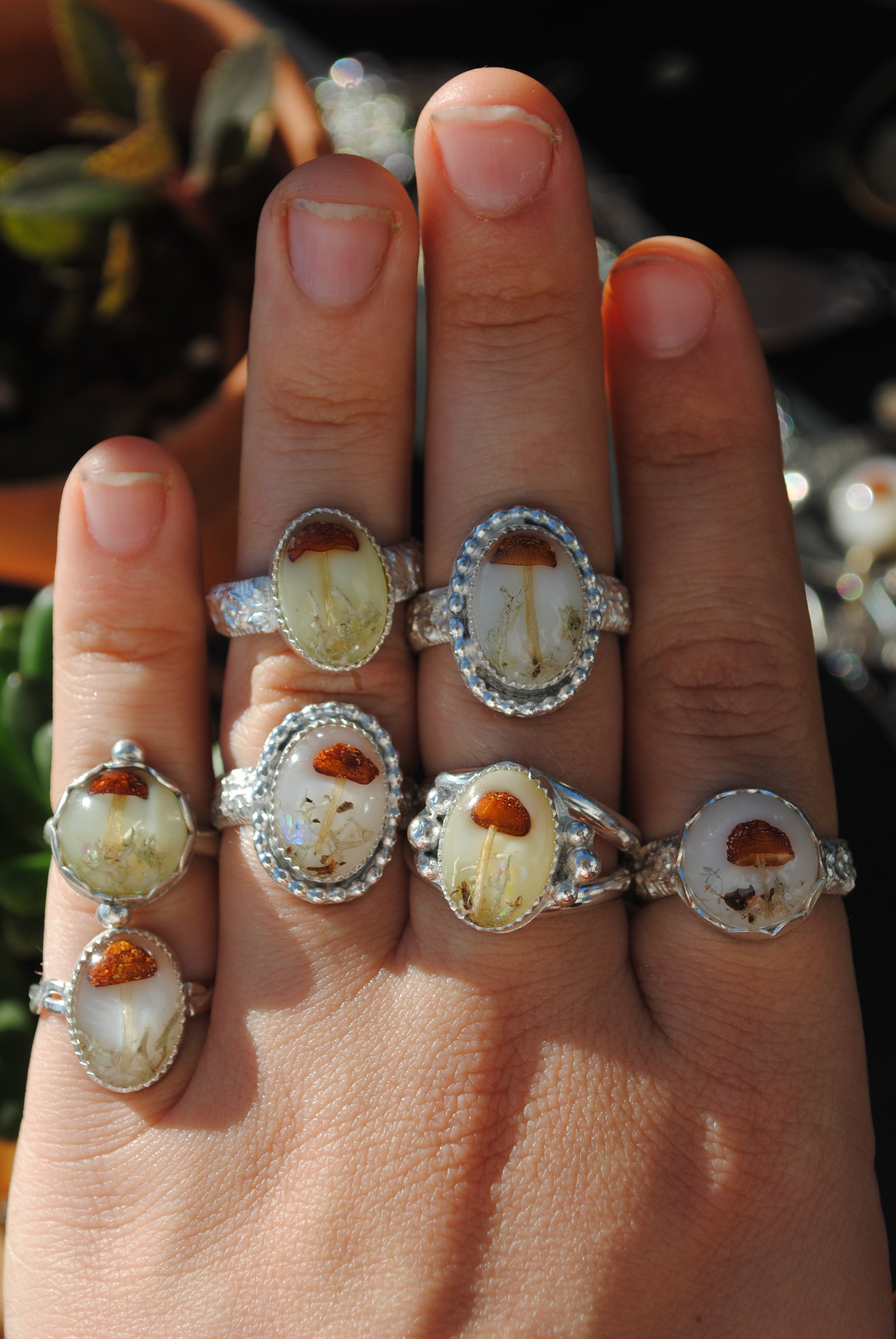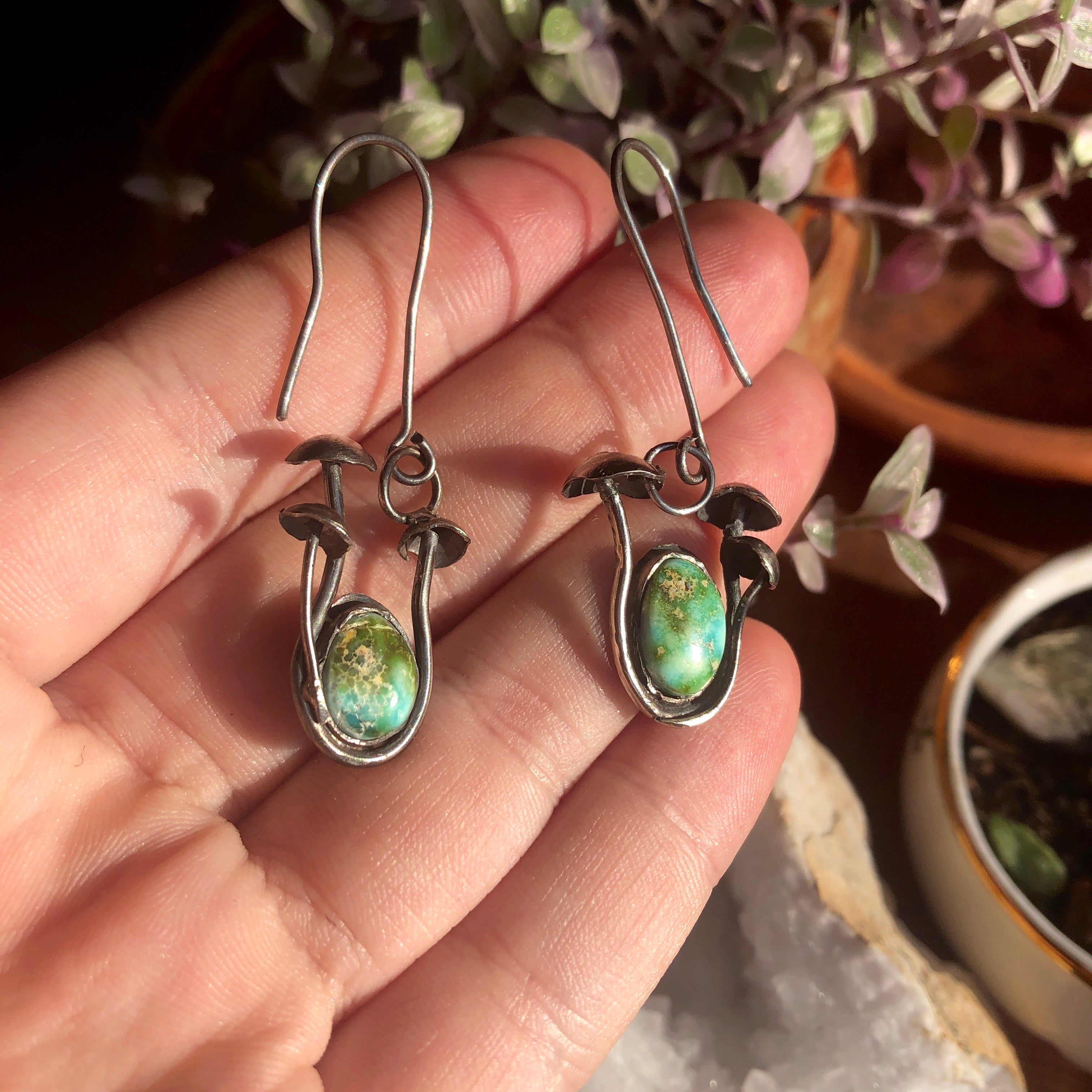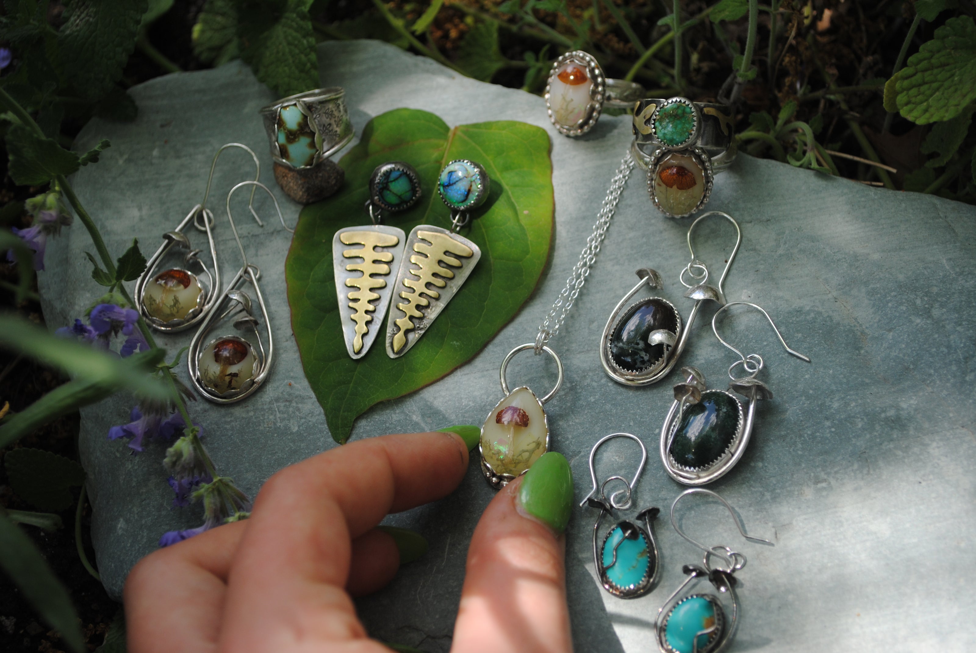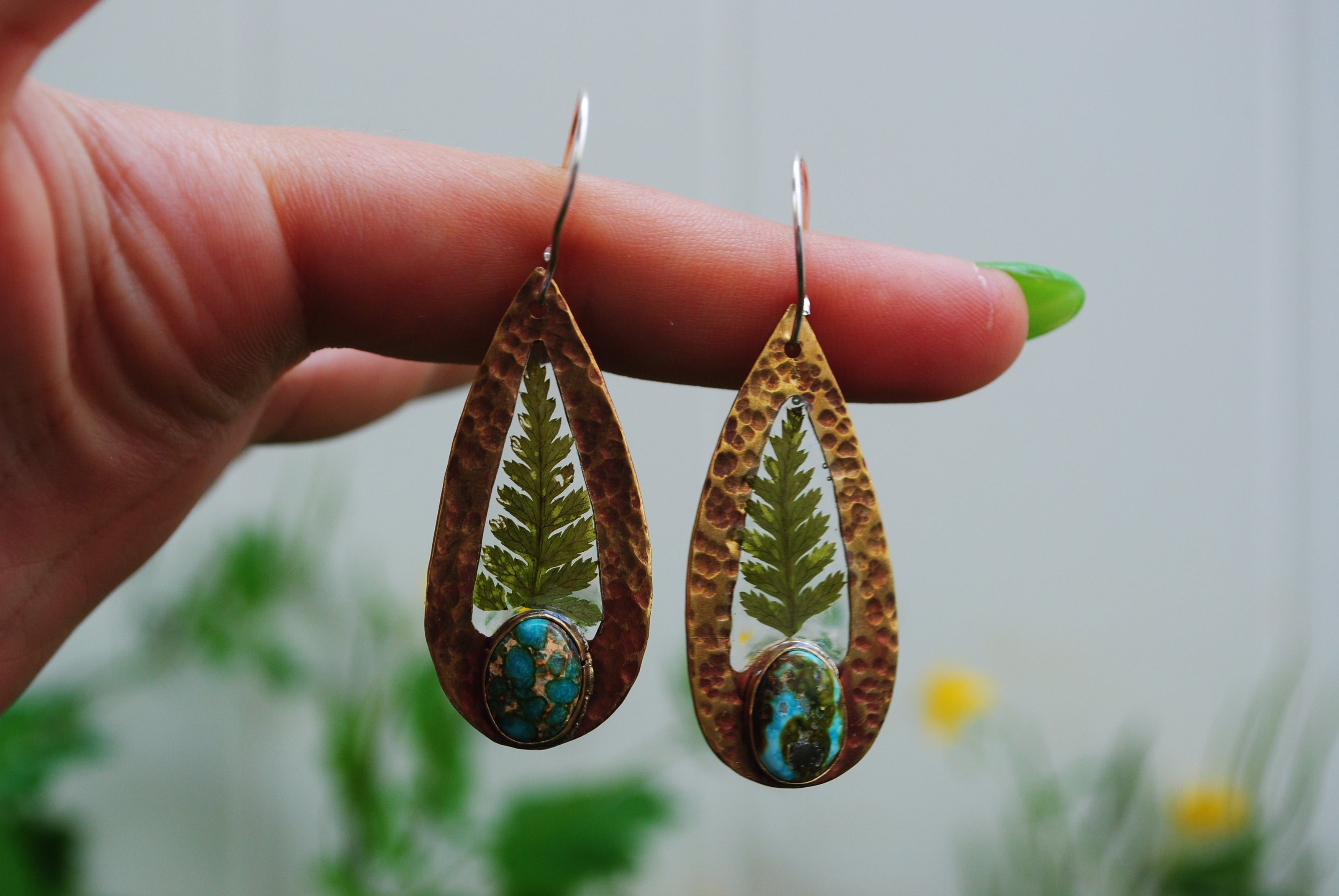 From the Woodland Mushroom Collection featuring hammered brass, real ferns, and turquoise stones