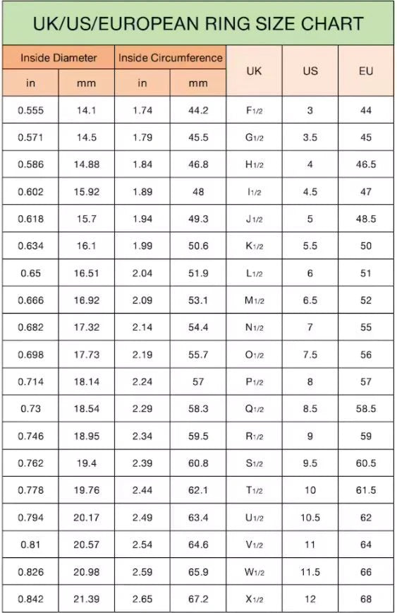 Take a ring you already own and use a ruler to measure from one inside edge to the other. Use this chart to match up your measurement with a ring size!