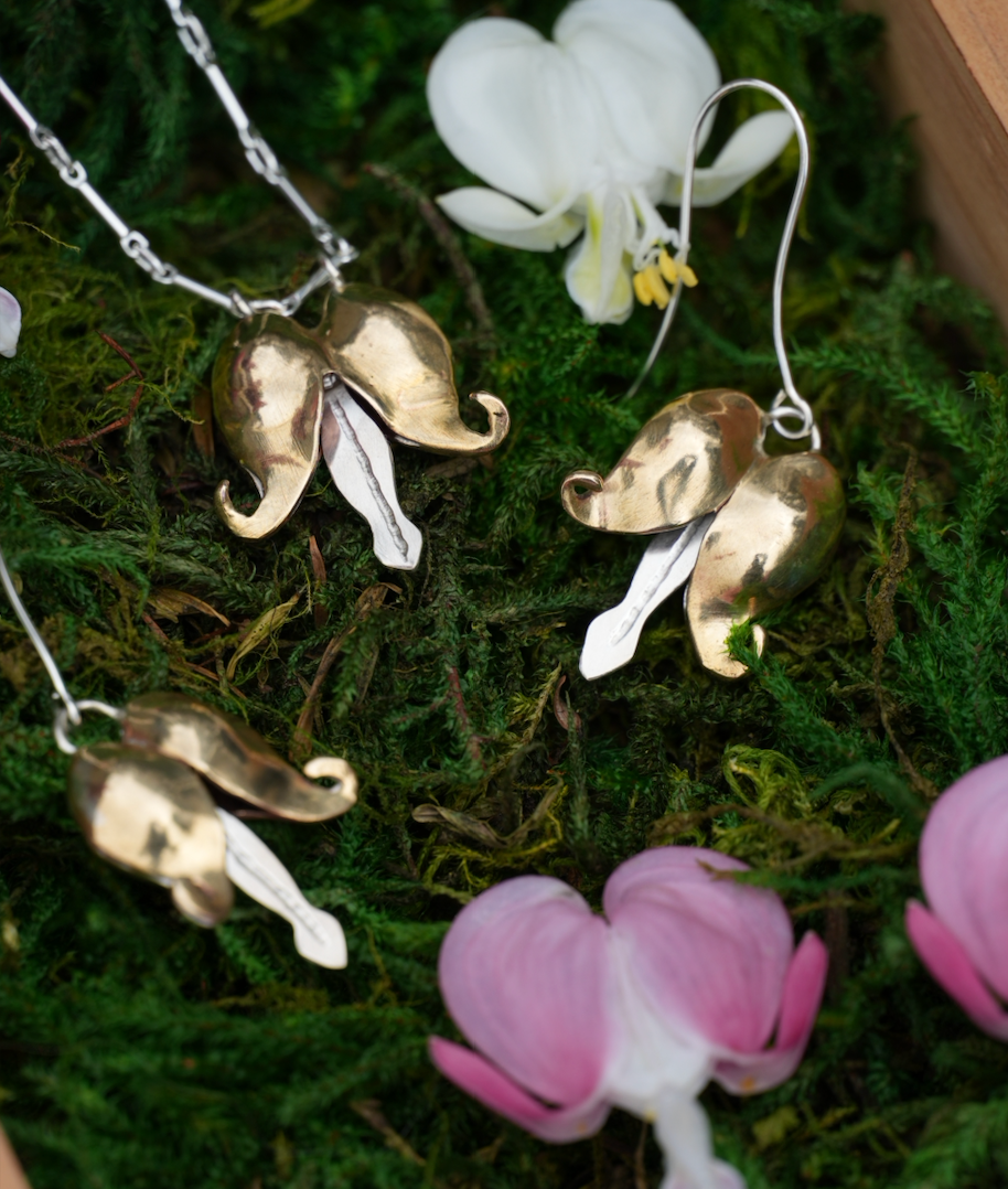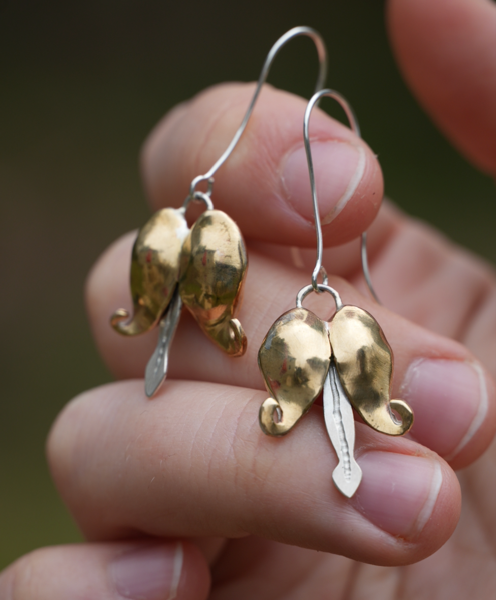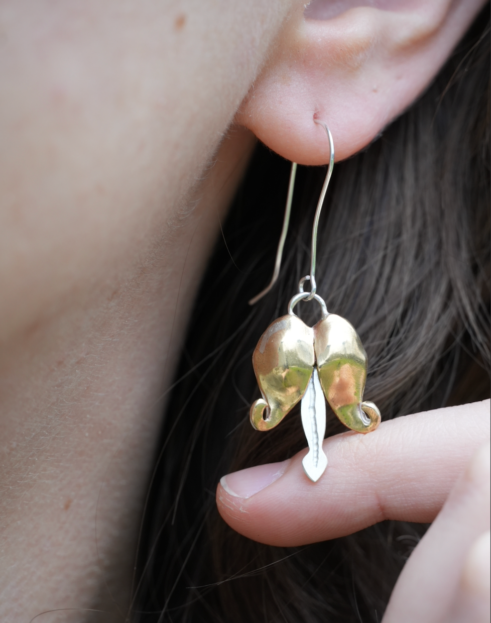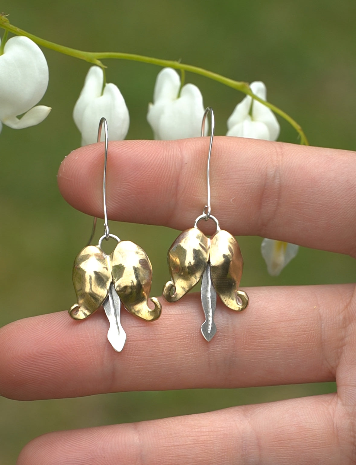 ✧ Hand-formed brass and sterling silver replicating bleeding heart blooms. These hand at approximately 1.5" with a kinetic dangling element.