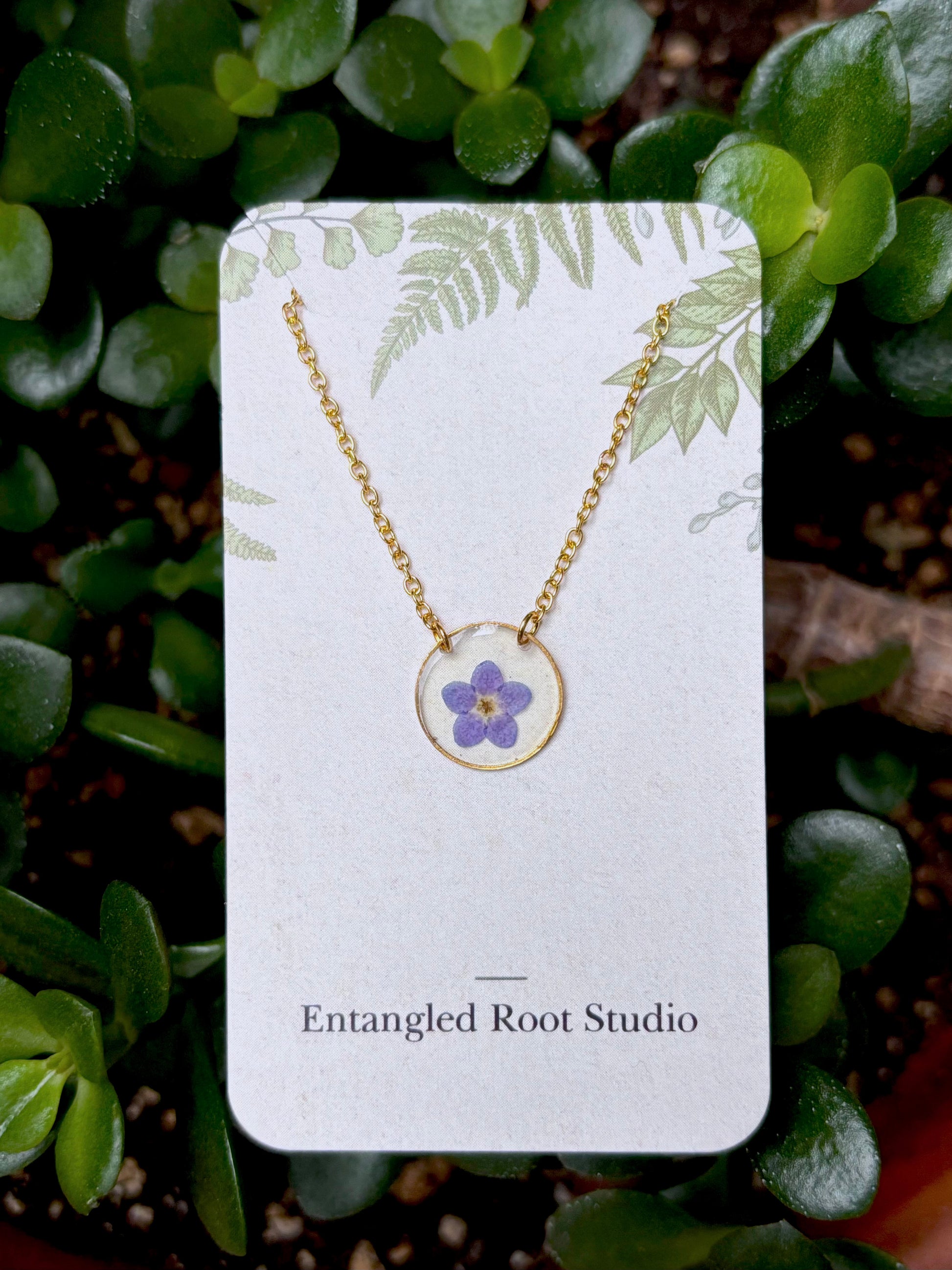 Carry a bit of mother nature everywhere with this dainty necklace. Real, hand-picked forget-me-not preserved in resin on your choice of silver or gold chain.
