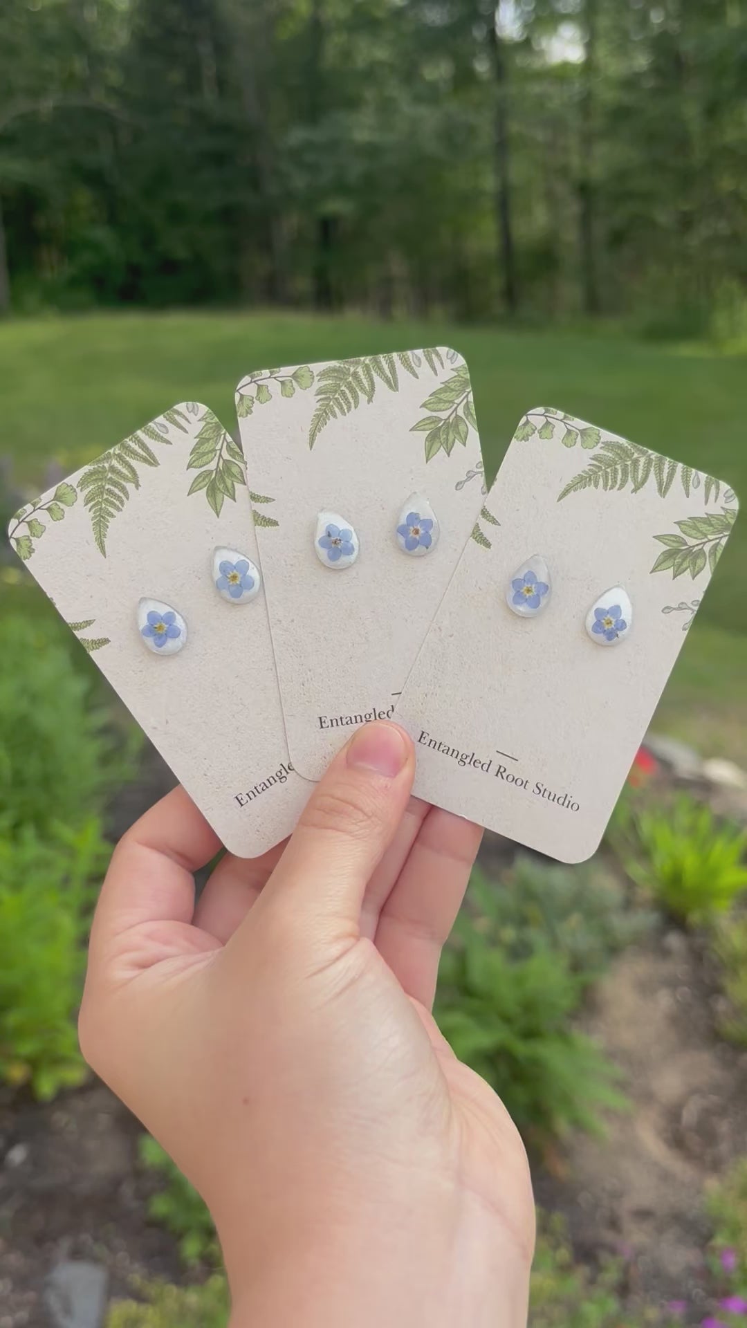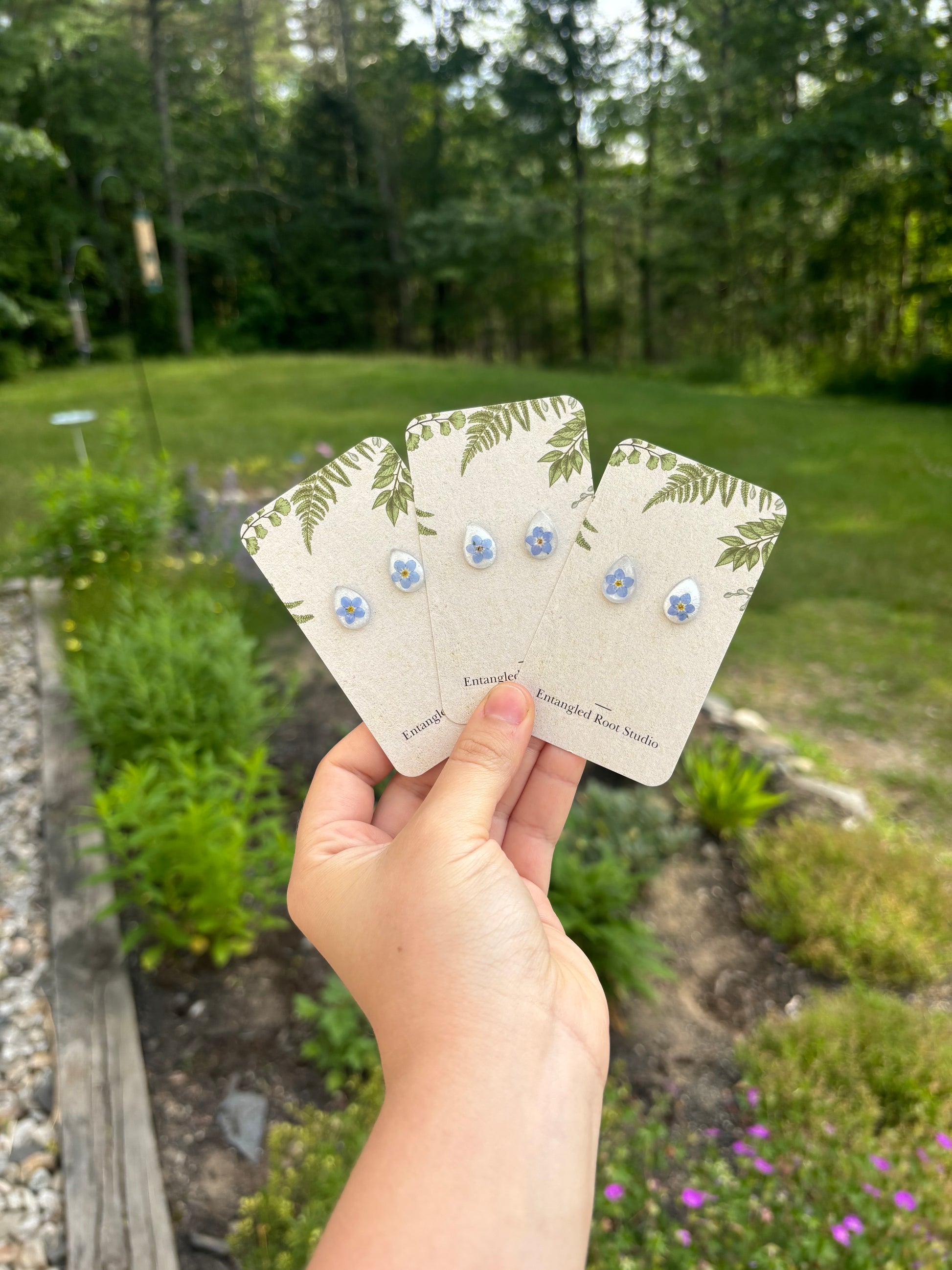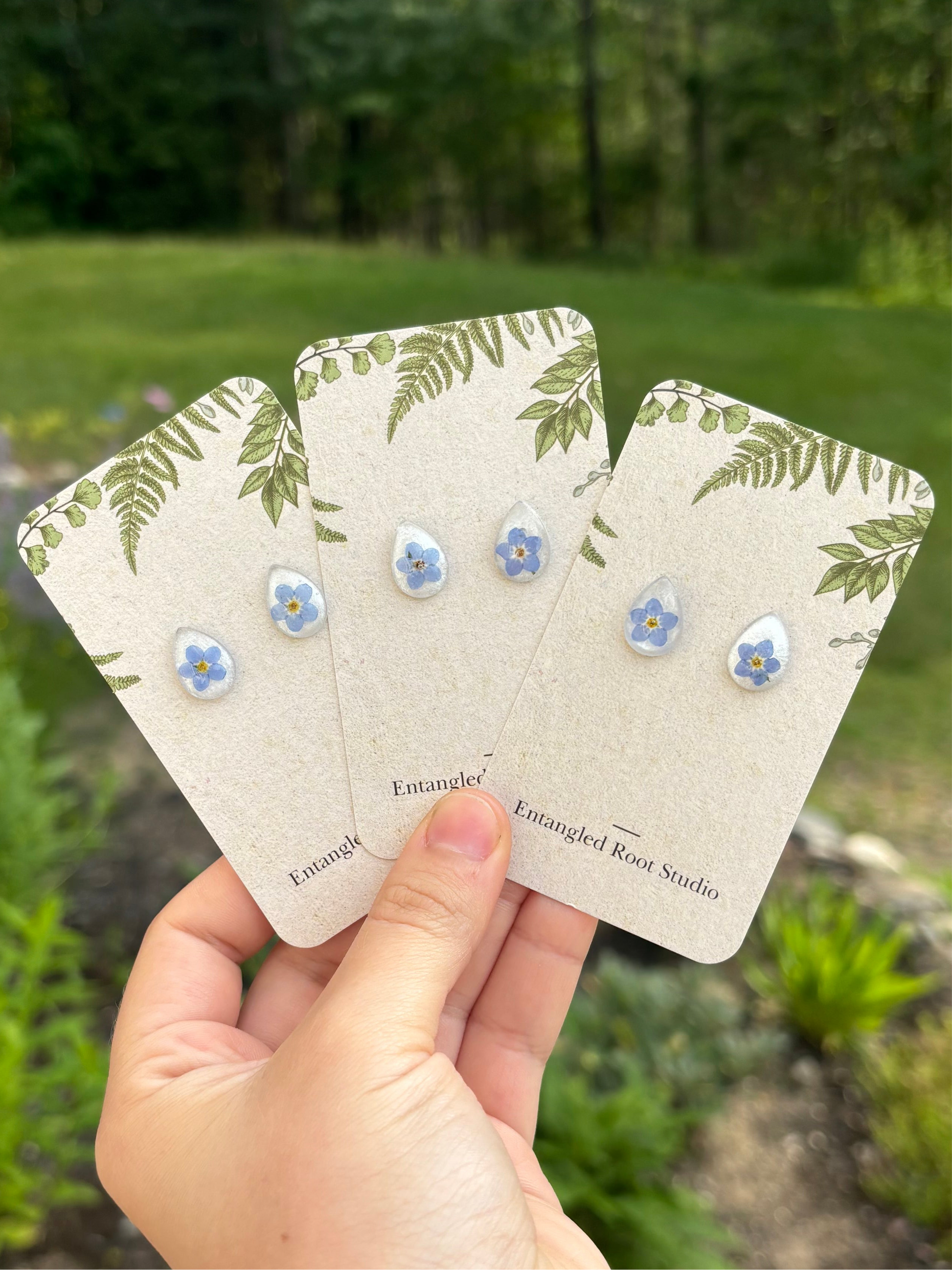 Have teeny flowers whispering into your ears all day with these dainty studs. They have a real forget-me-not preserved in resin with a sterling silver stud. Perfect for sensitive ears.
