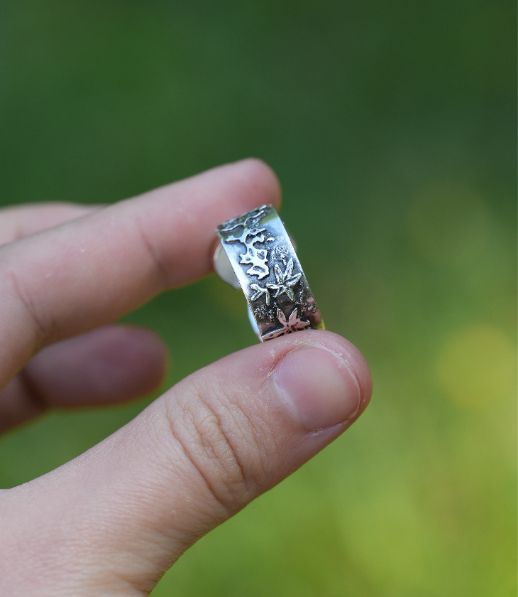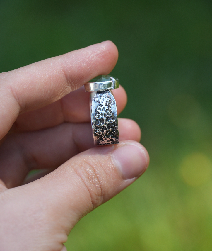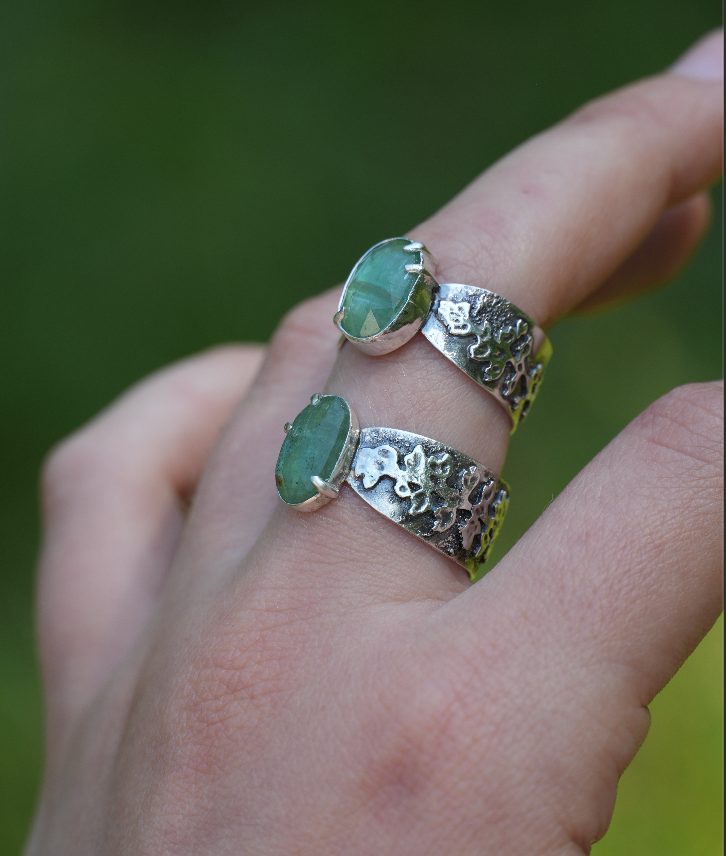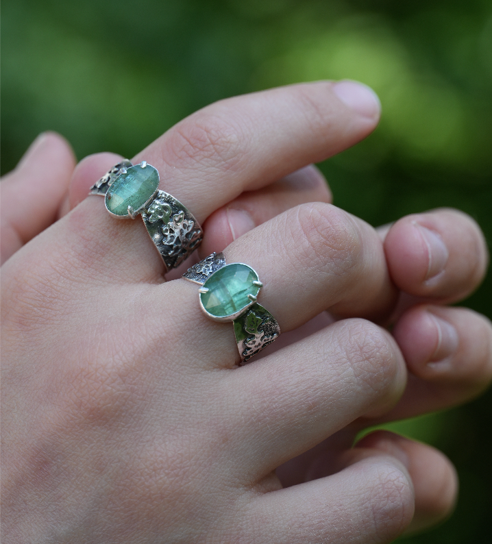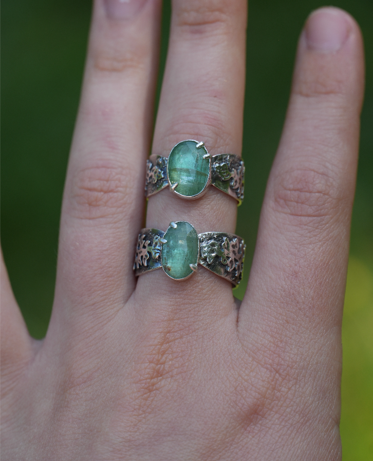 Hand-forged in the summer sun, these rings have lupines climbing the band up to a green kyanite stone. The lupines are dappled with silver dust and carefully carved to mimic mother nature's work.
