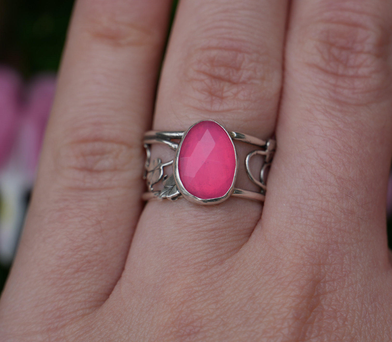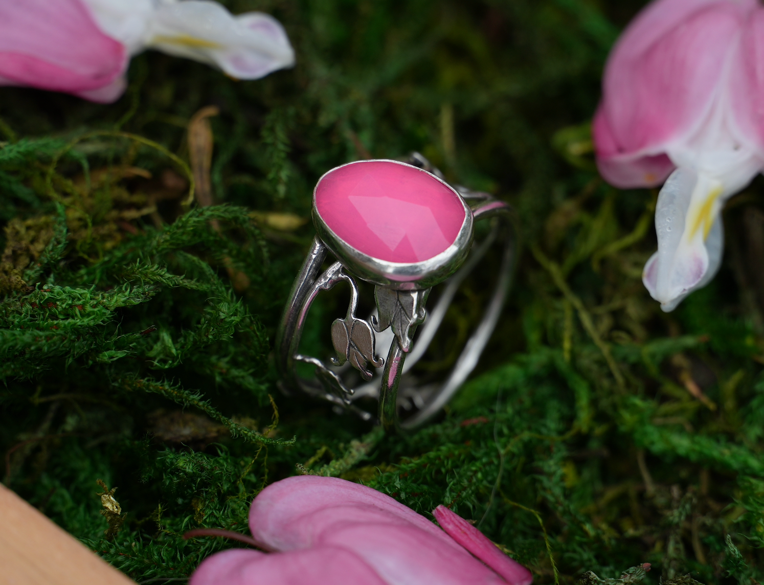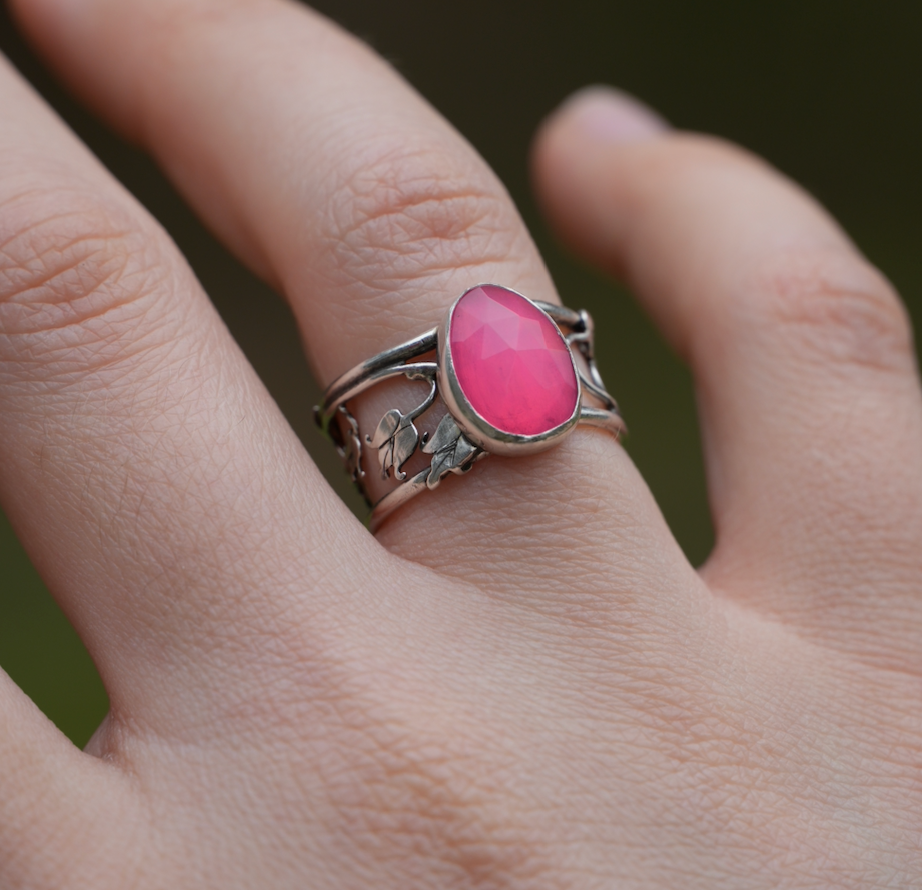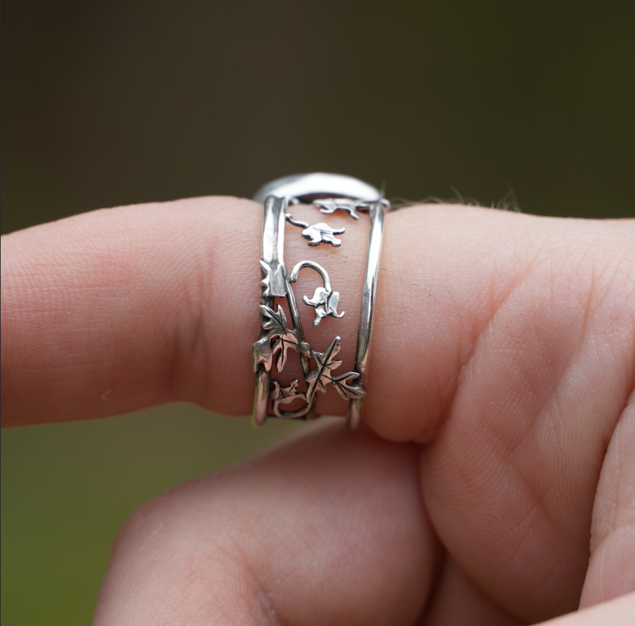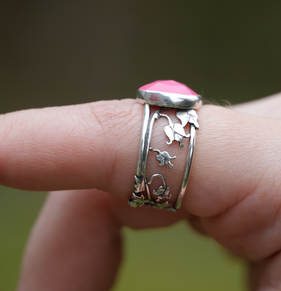 Dainty bleeding hearts climb the band of this ring leading you to a beautiful bright opal