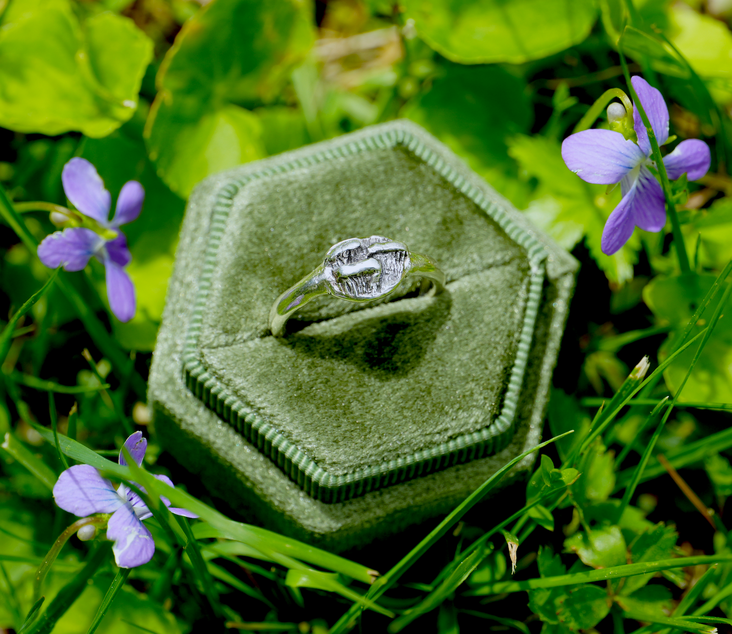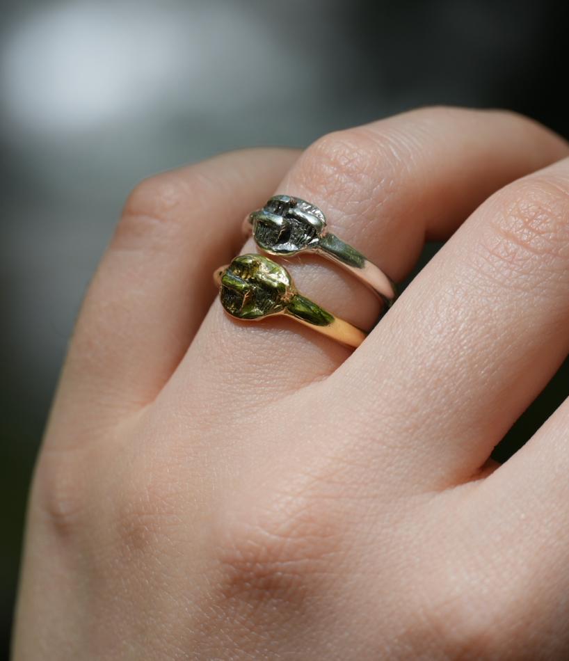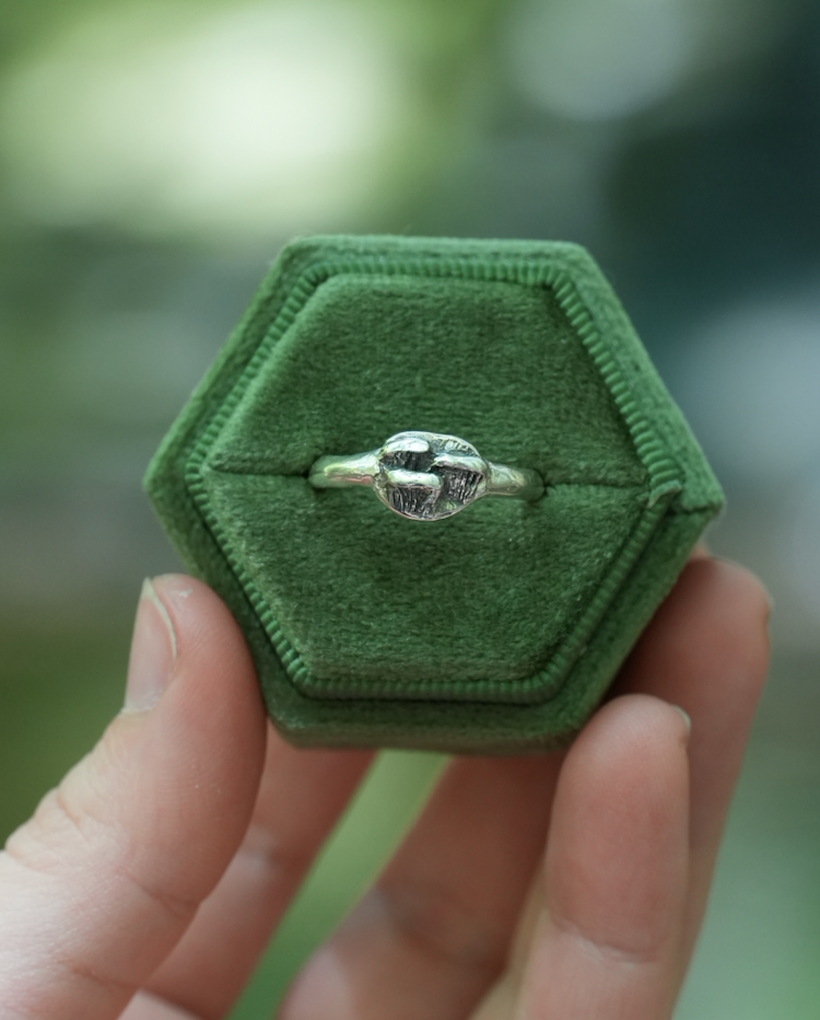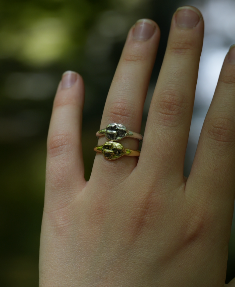 Hand carved rings inspired by oyster mushrooms climbing fallen trees