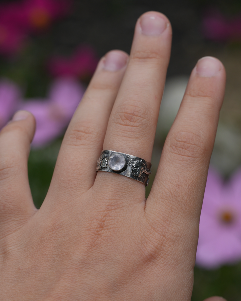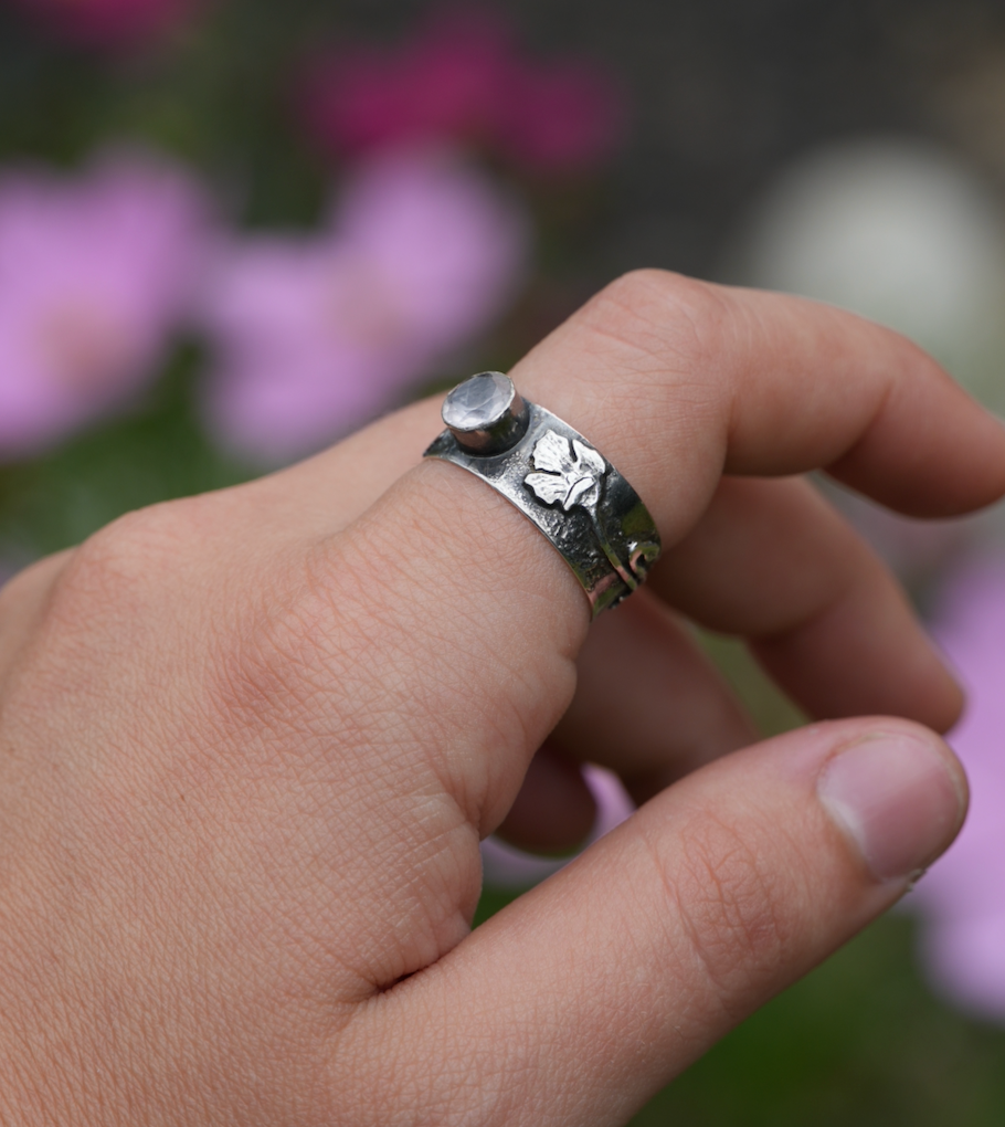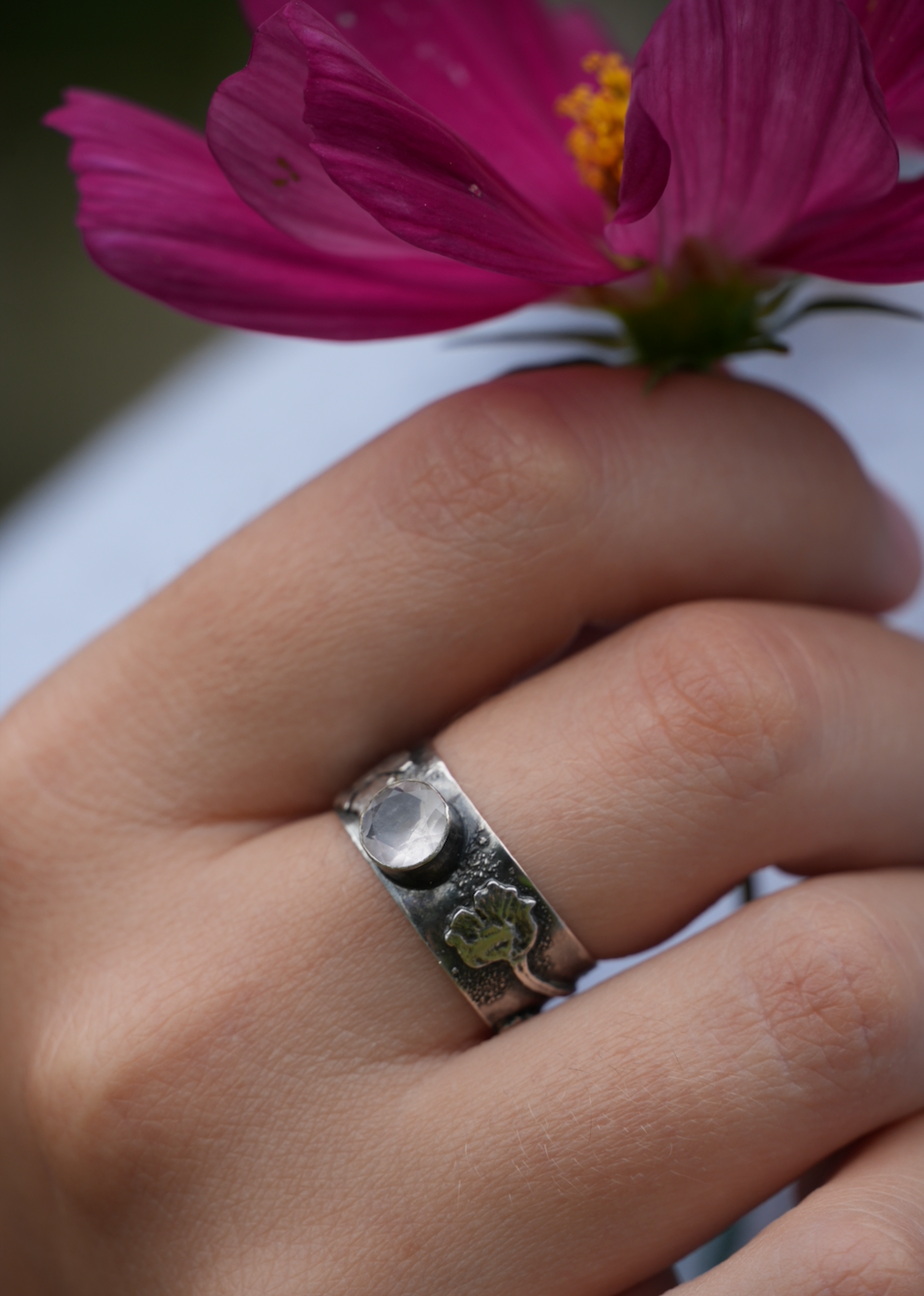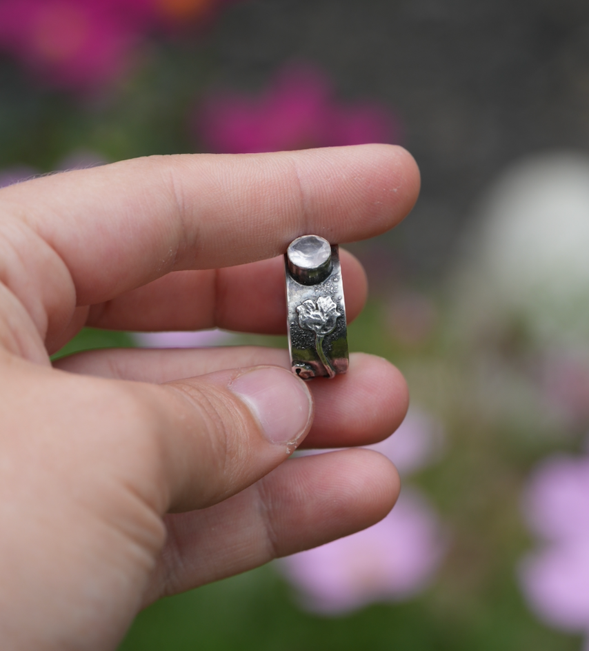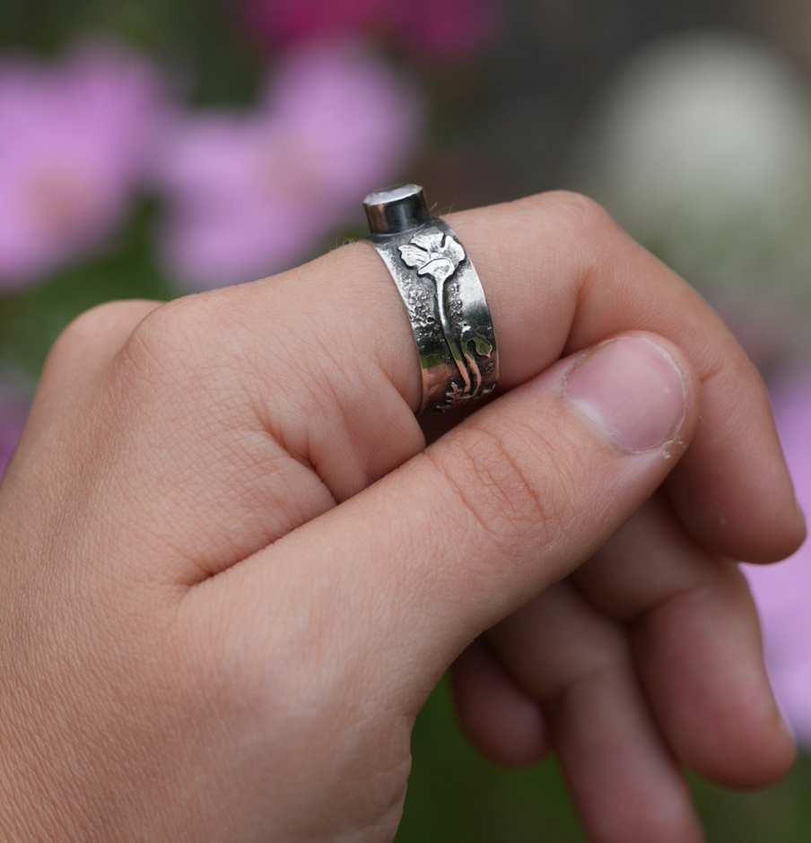 Explore the magic of poppies with this delicate ring. This ring was crafted to be a comfy, everyday piece that you don't have to think about when wearing! With dainty poppy flowers that were hand-carved and sawed that bring you your own unique bloom.